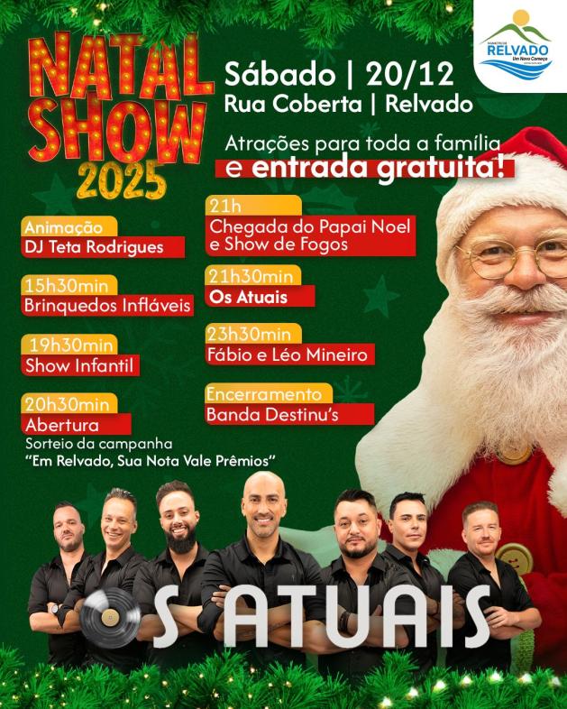 Outro destaque do Natal Show Show 2025 é a programação musical, que começa às 21h30min. A grande atração da noite fica por conta da Banda Os Atuais. Os Reis do Baile sobem ao palco com sucessos como “Barco do Amor”, “Rosto Desmaquiado”, “Pássaro Livre”, “Alice”, entre outros do melhor do bailão.